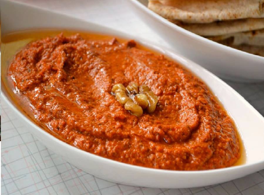 Στο μπολ ενός επεξεργαστή τροφίμων(μπλεντερ), χτυπήστε τα καρύδια, ψητές πιπεριές, ψίχουλα ψωμιού, σκόρδο, μελάσα ροδιού, κύμινο, νιφάδες κόκκινου πιπεριού και αλάτι μέχρι να αναμειχθούν καλά.