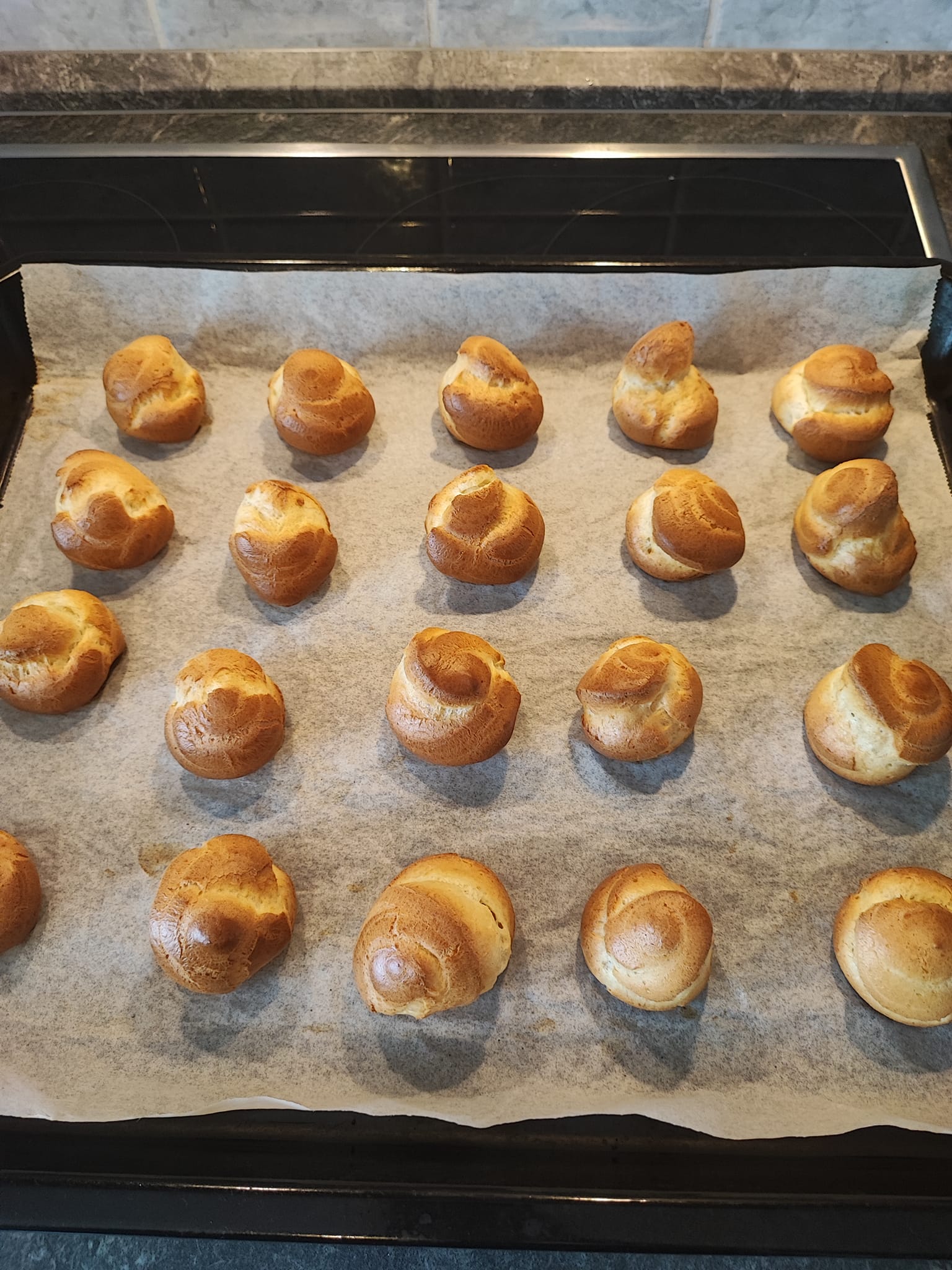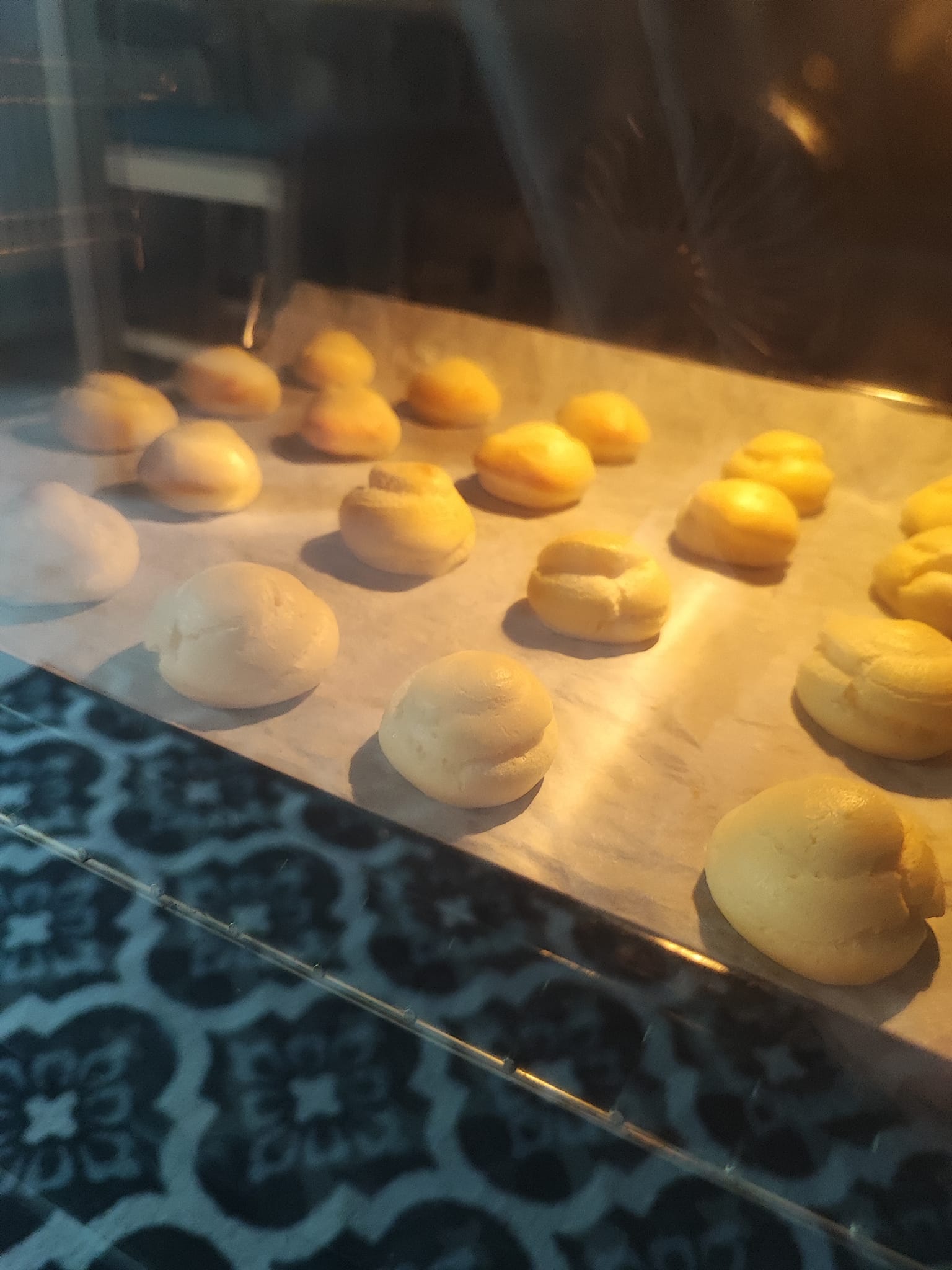Σε ταψί με λαδόκολλα απλώνουμε τη ζύμη μας με το κορνέ, κάνοντας σουδάκια.