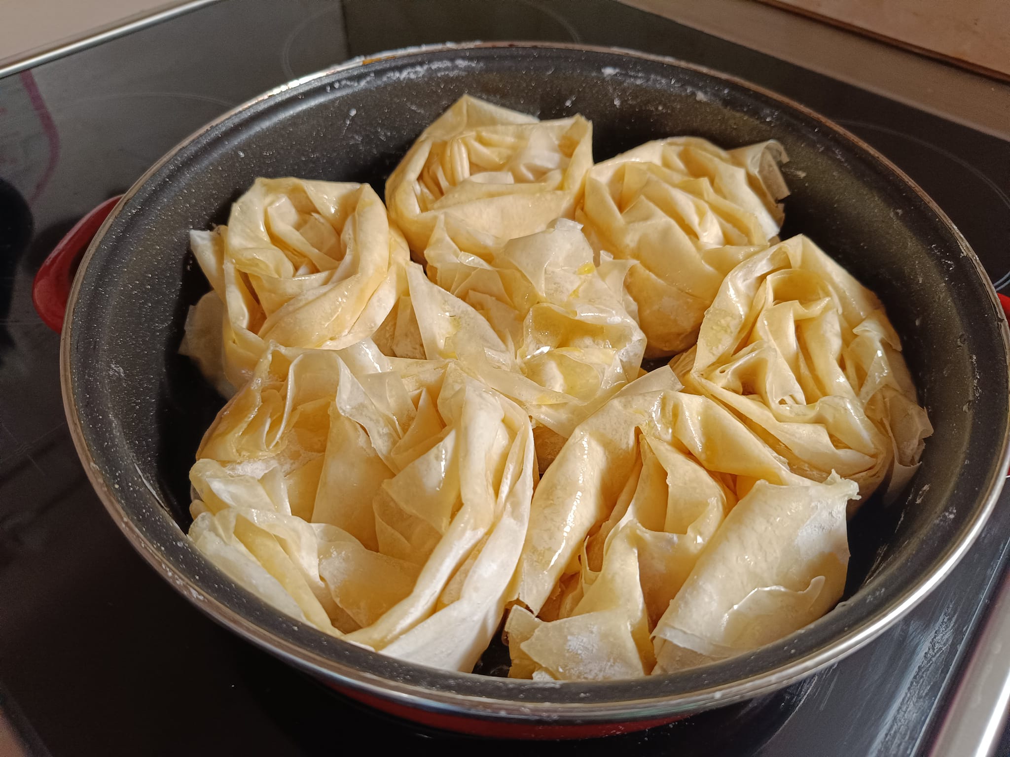 τοποθετούμε σε φόρμα (μπορεί να είναι και σε ταψί) και ούτω καθεξής μέχρι να τελειώσουν τα φύλα.