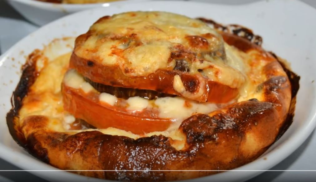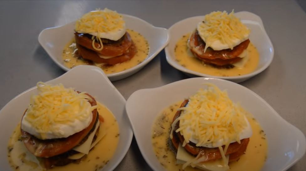 Οταν έχουν ψηθεί τότε σε 4 πυρίμαχα πιατάκια βάζουμε από μία μελιτζάνα από πάνω ντομάτα και από πάνω το τυρί κασσέρι. Αυτο το επαναλαμβάνουμε άλλες 2 φορές (μελιτζανα – ντοματα -τυρι) στην τρίτη στρώση βάζουμε μελιτζάνα και μια φετα τυρι μοτσαρέλα.