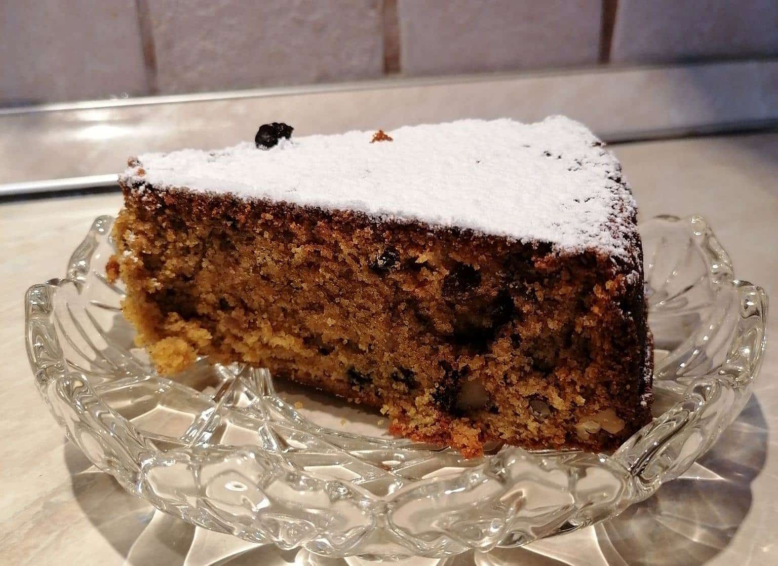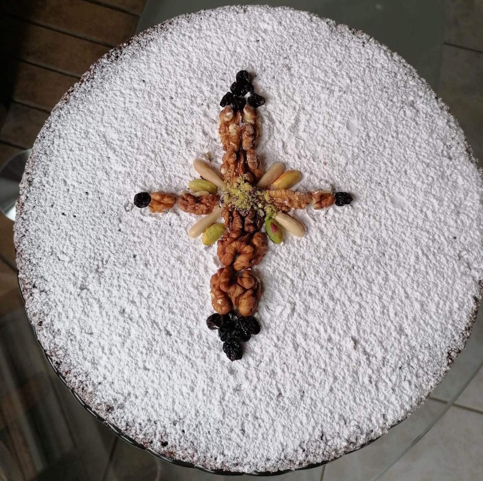 Χονδρό κόβουμε τά καρύδια. Παίρνουμε 2 κ.σ.αλευρι από το ζυγισμενο το βάζουμε σέ ενα σκεύος που εκεί βάζουμε τα καρύδια και τις σταφίδες.Το αφήνουμε στην άκρη.