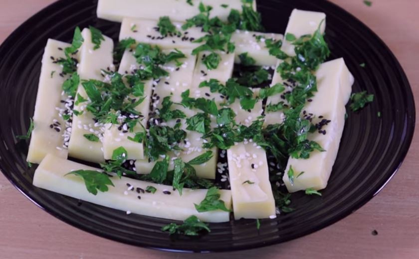 Εν τω μεταξύ κόβουμε ένα κομμάτι τυρι τσενταρ σε μπαστούνια και τα πασπαλίζουμε με λευκο και μαύρο σουσάμι καθώς και ψιλοκομμένο μαϊντανό.