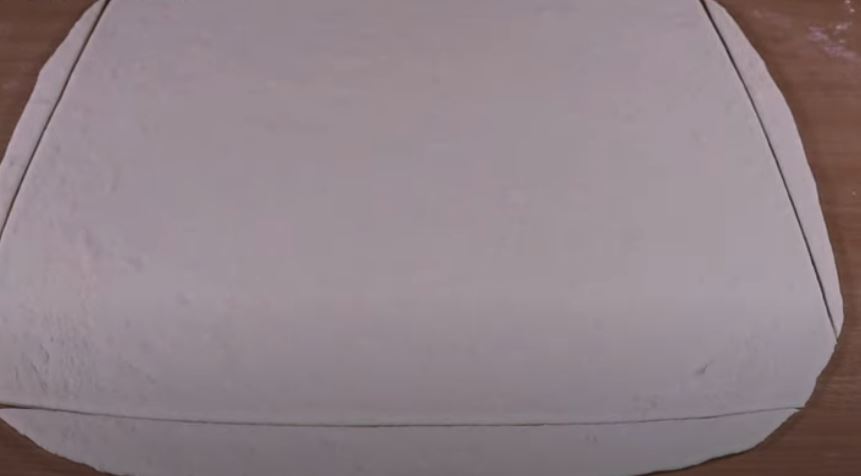 Βγάζουμε την ζύμη σε μια αλευρωμένη επιφάνεια και την ανοίγουμε με ένα πλαστη χοντρο σε ένα φύλλο πάχους μισού εκαταστου κα το τετραγωνίζουμε.