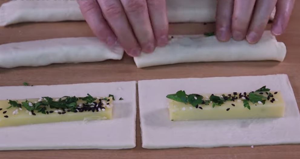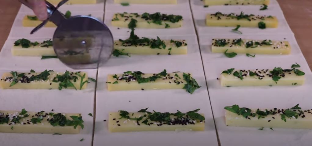 Τοποθετούμε τα τυράκια πάνω στο φύλο και κόβουμε όπως βλέπετε στην φωτό