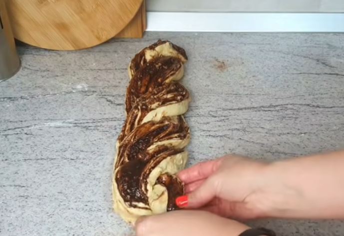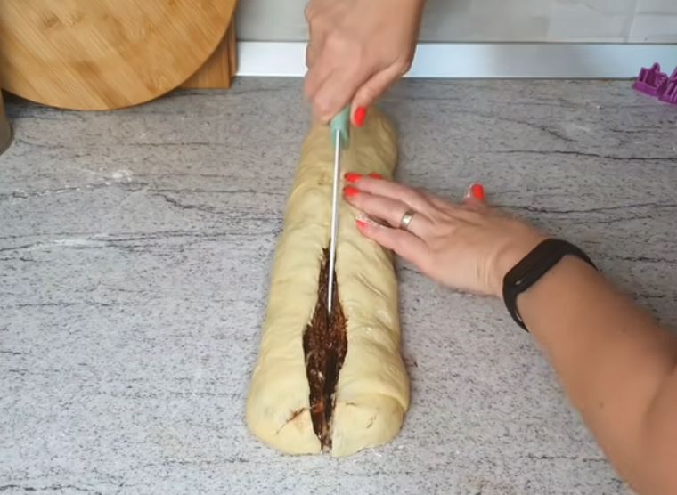 Με το μαχαίρι κόβουμε κατά μήκος στην μέση το ρολό, και με τα δυο κομμάτια κάνουμε μια πλεξούδα ,