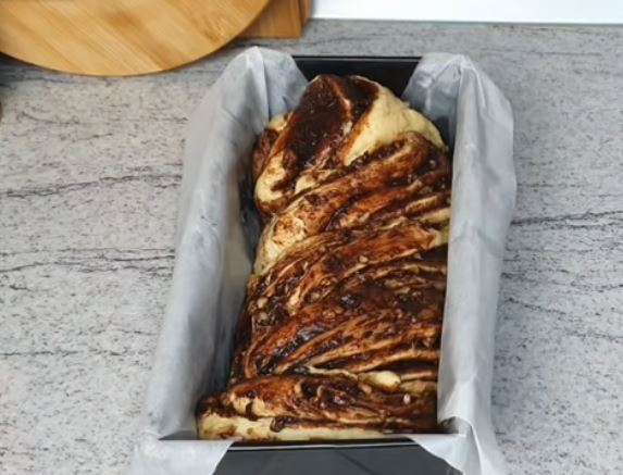 βουτυρώνουμε μια μακρόστενη φόρμα η μπορούμε να χρησιμοποιήσουμε λαδόκολλα, και τοποθετούμε μέσα προσεχτικά την πλεξούδα,