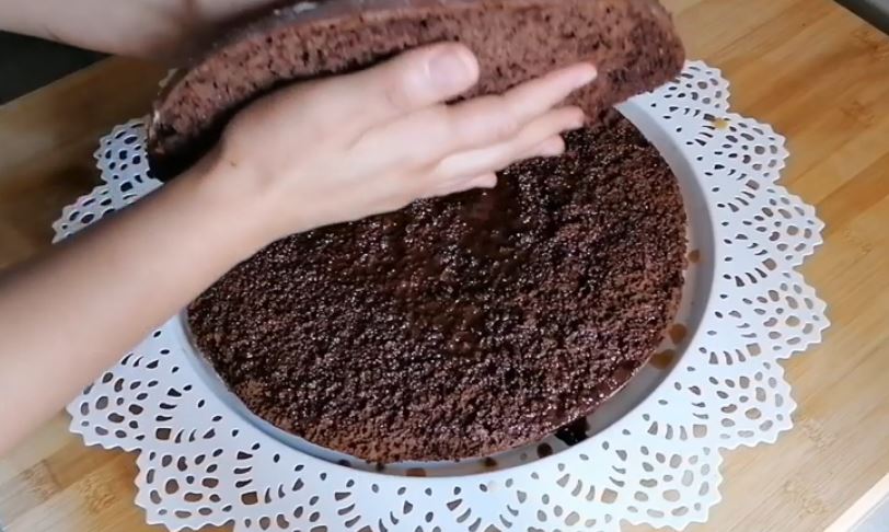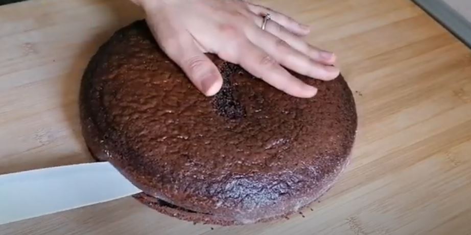 Βγάζω την ψημένη βάση του κέικ από τον φούρνο και κάνω πολλές τρύπες με ένα καλαμάκι. Κόβω τη βάση οριζόντια σε δύο μέρη.
