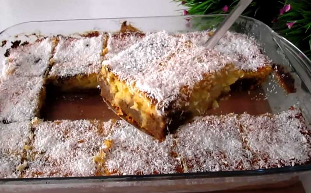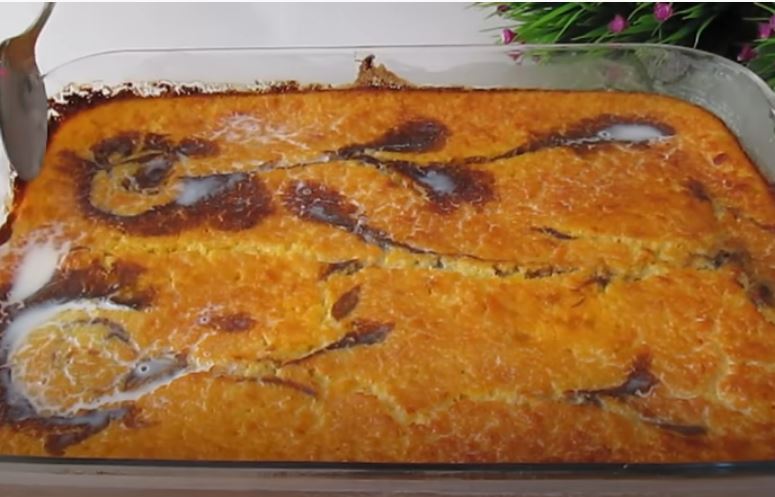 Μόλις το βγάλουμε απ τον φούρνο το περιχύνουμε με το κρύο γάλα σιγά σιγά κουταλιά κουταλιά.