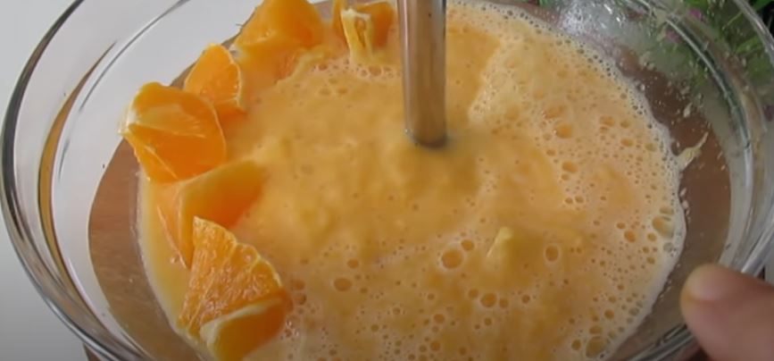 Καθαρίζουμε τα πορτοκάλια αφαιρούμε τα λευκά μέρη του εσωτερικού και τα κόβουμε σε μικρά κομμάτια. Τα πολτοποιούμε με τη ράβδο η το μπλέντερ.