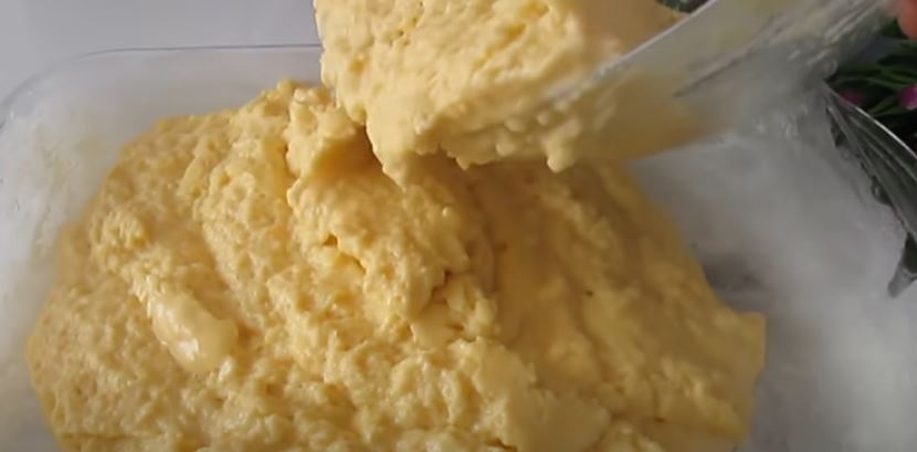 Βουτυρώνουμε με μισό κουταλάκι του γλυκού βούτυρο το πυρέξ μας το αλευρώνουμε με μία κουταλιά της σούπας αλεύρι και αδειάζουμε τα 3/4 από το μείγμα. Απλώνουμε να πάει παντού.