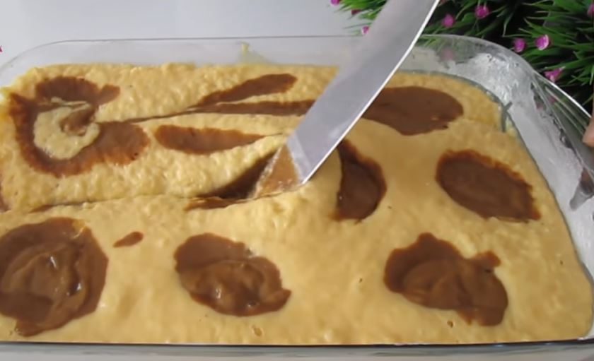 Στη συνέχεια το ρίχνουμε στο πυρέξ κουταλιά κουταλιά πάνω απ το άλλο μείγμα.