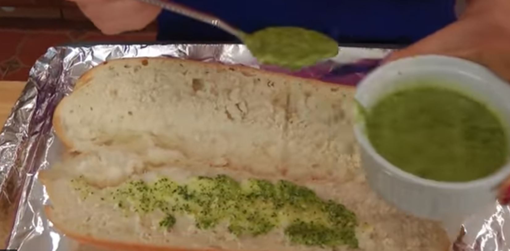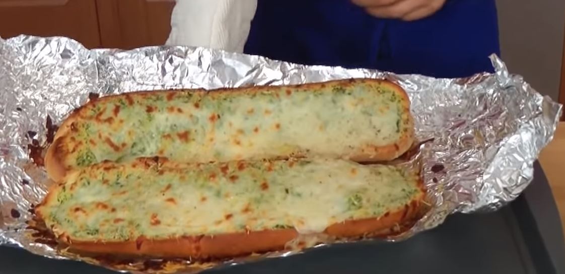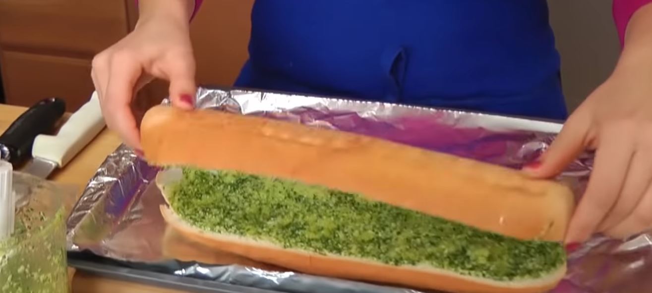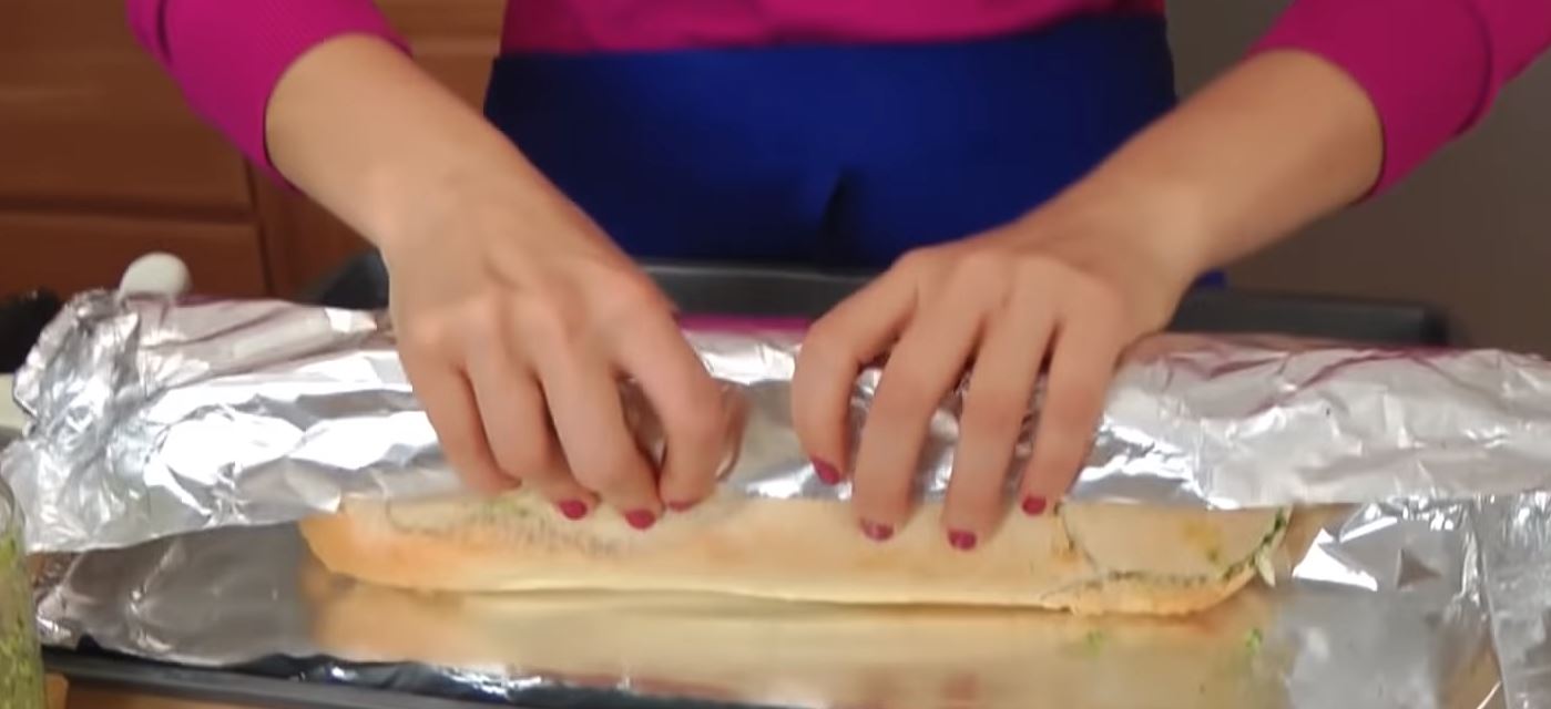 3) Βάλτε αυτό το μείγμα και στις δύο πλευρές του ψωμιού. Κλείστε το ψωμί και τυλίξτε το σε αλουμινόχαρτο, ψήστε το για 10 λεπτά.