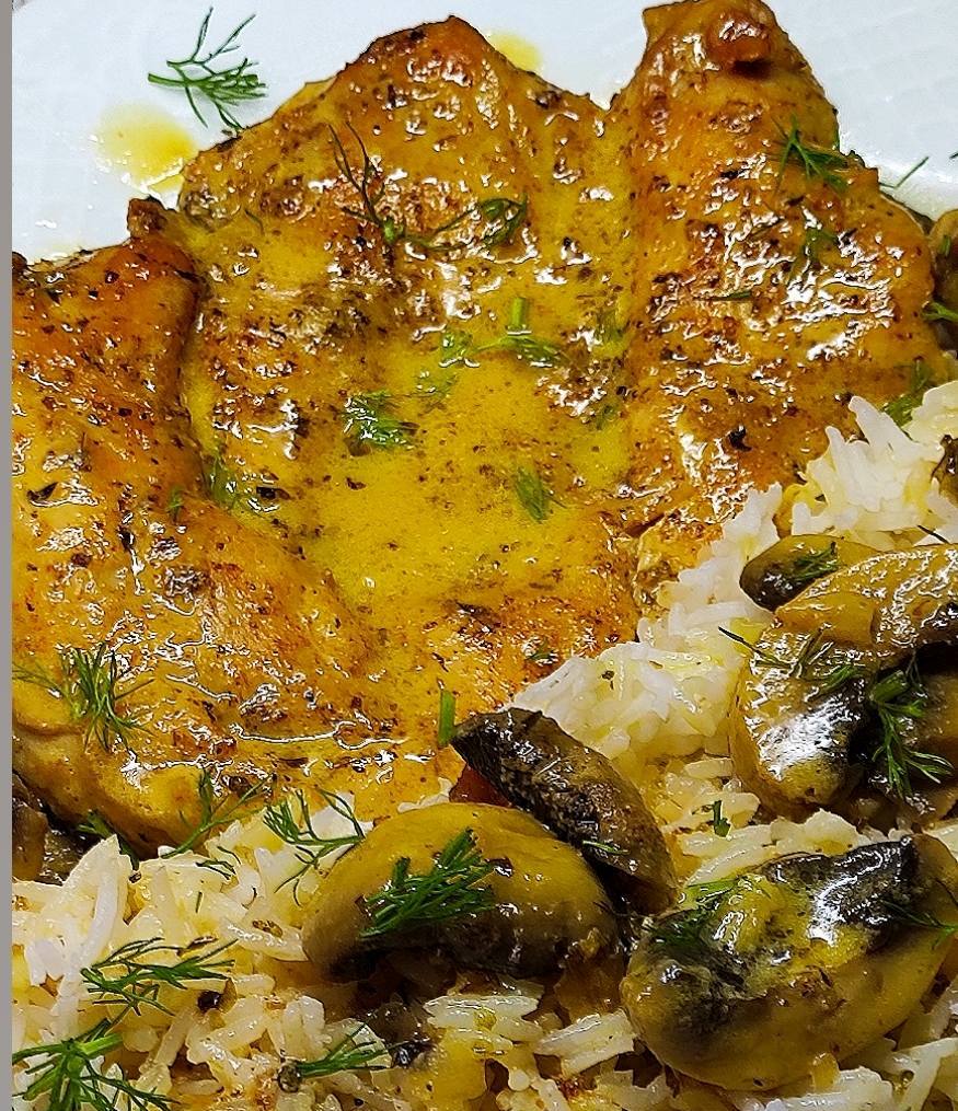 Φτιάξτε αρωματικό φιλέτο κοτόπουλο με κρεμώδη σάλτσα κουρκουμά , μανιτάρια και μάραθο . Συνταγή με πλούσια μαρινάδα και κρέμα χωρίς λακτόζη . Σερβίρεται με ρύζι μπασμάτι & πλιγούρι.