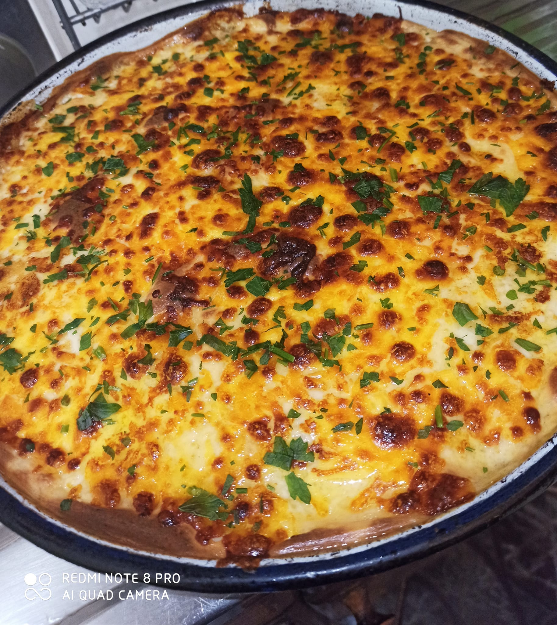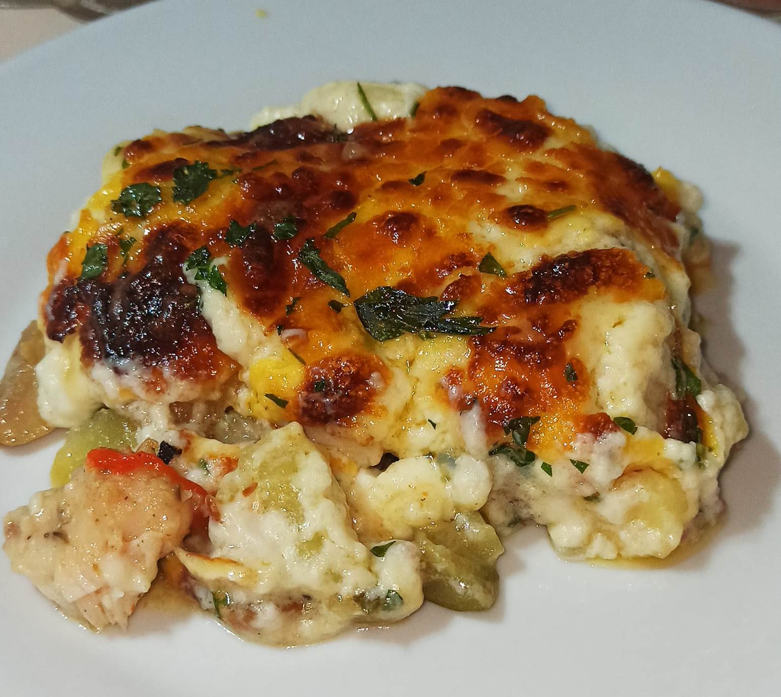 Ρίχνουμε το μείγμα της κρέμας πάνω από τα υπολοιπα και πασπαλίζουμε με τα πράσινα αρωματικα.