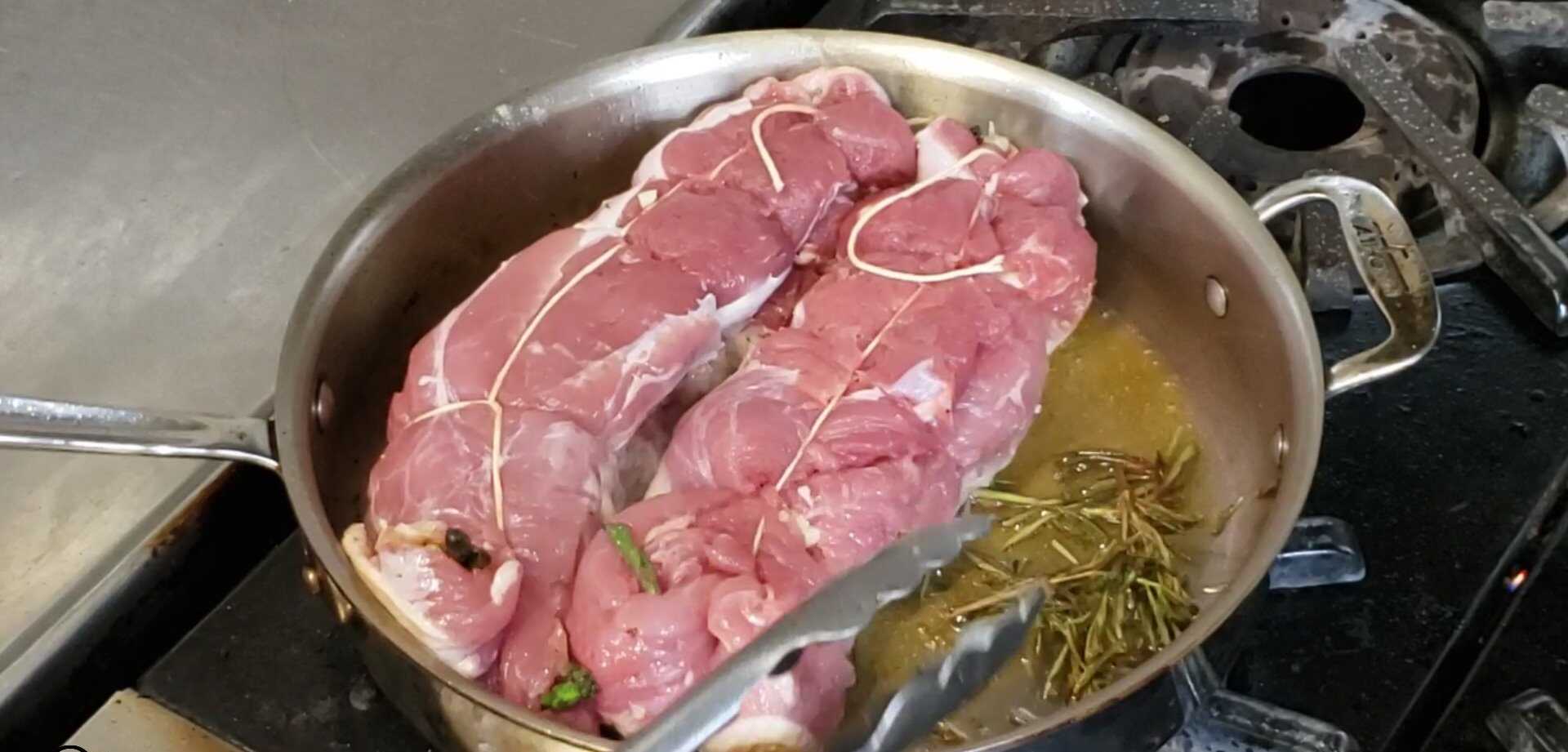 Μόλις γίνει καφέ το δεντρολίβανο αφαιρέστε, συνεχίστε να μαγειρεύετε χοιρινό φιλέτο