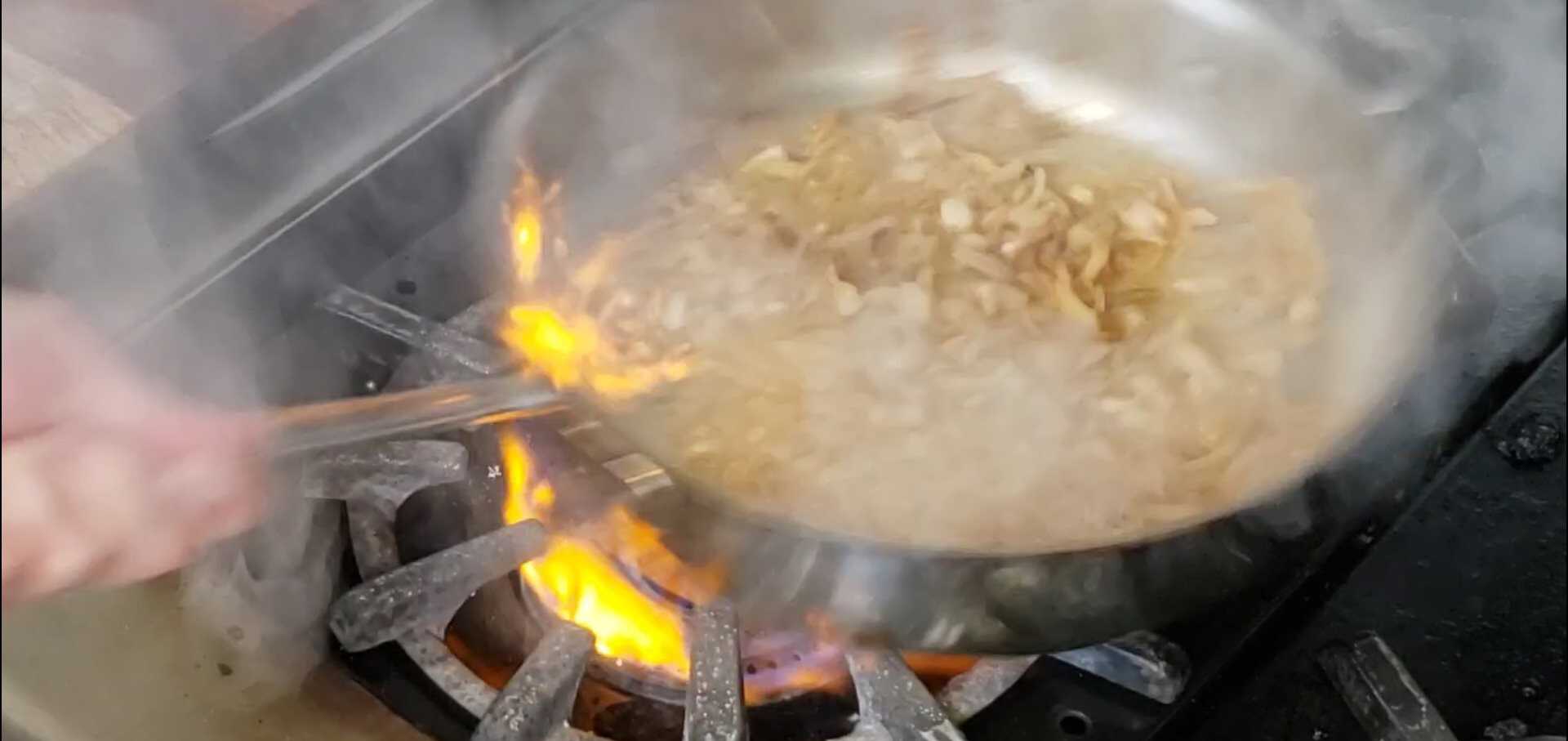 Στο ίδιο τηγάνι με όλες τις γαρνιτούρες, θα κόψετε και θα προσθέσετε κρεμμύδια με ελαιόλαδο και σοτάρετε.