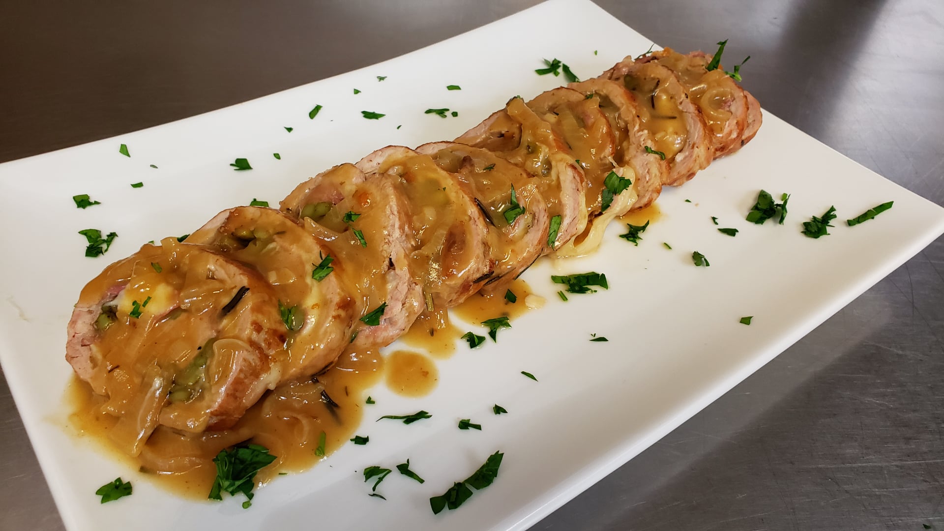 Κόψτε το χοιρινό φιλέτο σε φέτες σένα πιάτο και στο πάνω μέρος του καλυψτε το με σάλτσα και φρέσκο μαϊντανό.