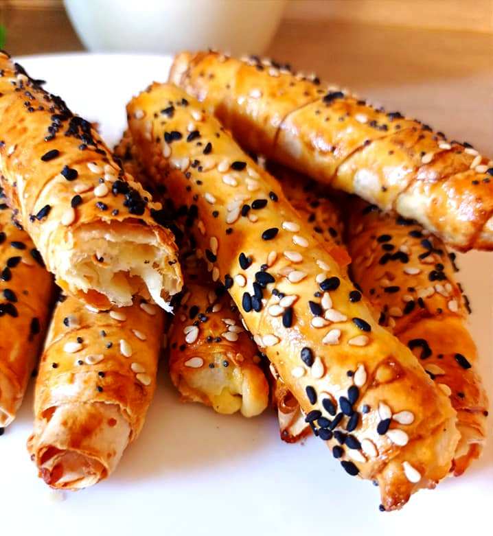 Τρίβουμε το τυρί και το κίτρινο τυρί. Λαδώνουμε ελαφρά τις κρούστες των φύλλων με το μείγμα των αυγών με ένα πινέλο και στο ένα άκρο βάζουμε το τυρί με κίτρινο τυρί, διπλώνουμε τις άκρες προς τα μέσα και τυλίγουμε σε σφιχτό ρολό (να μοιάζει με «κριτσίνι»).