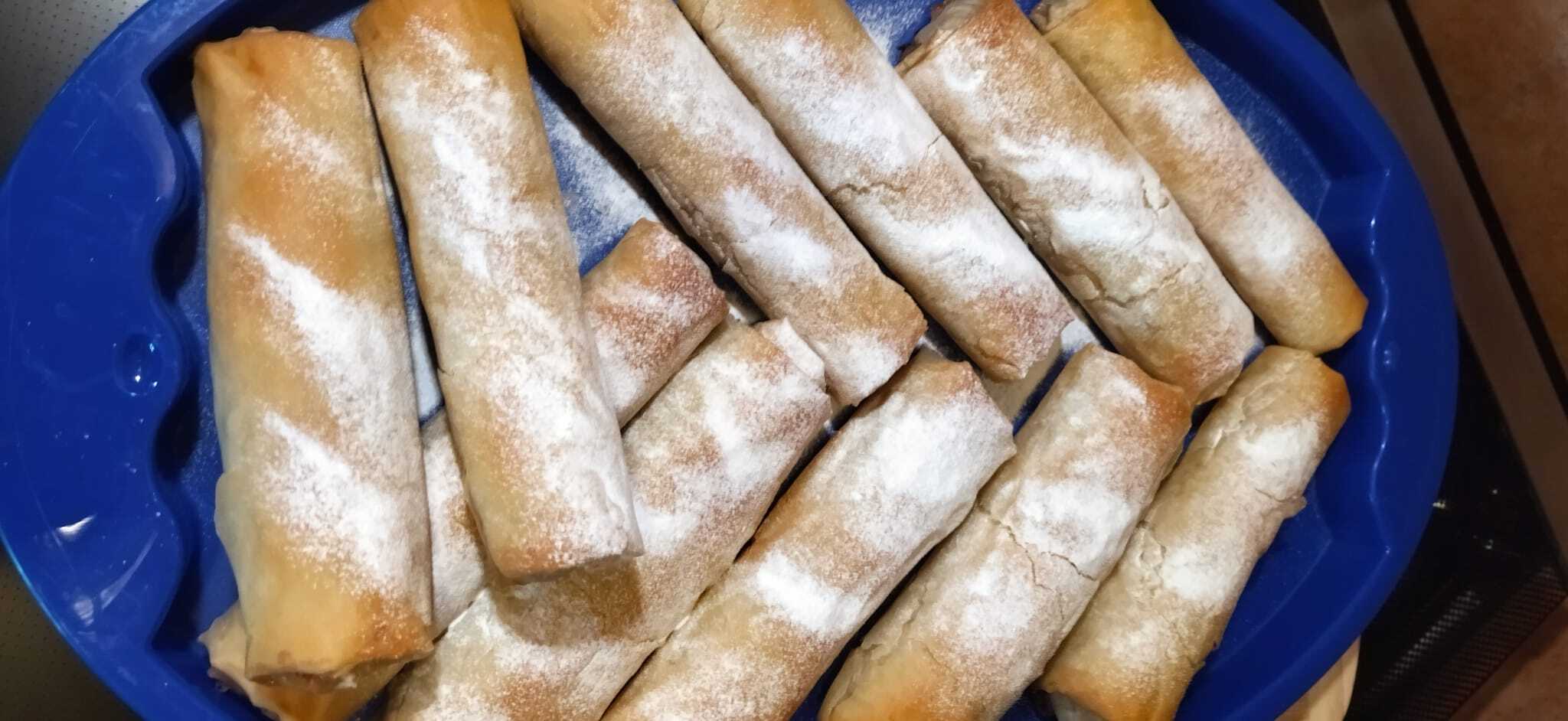 Άφησα τις φλογερες να κρυώσουν καλά και τα πασπαλίζω με ζάχαρη άχνη. Αν σας αρέσουν πιο μαλακά, καλύψτε τα κρύα ρολά με πλαστική μεμβράνη και σύντομα θα μαλακώσουν.