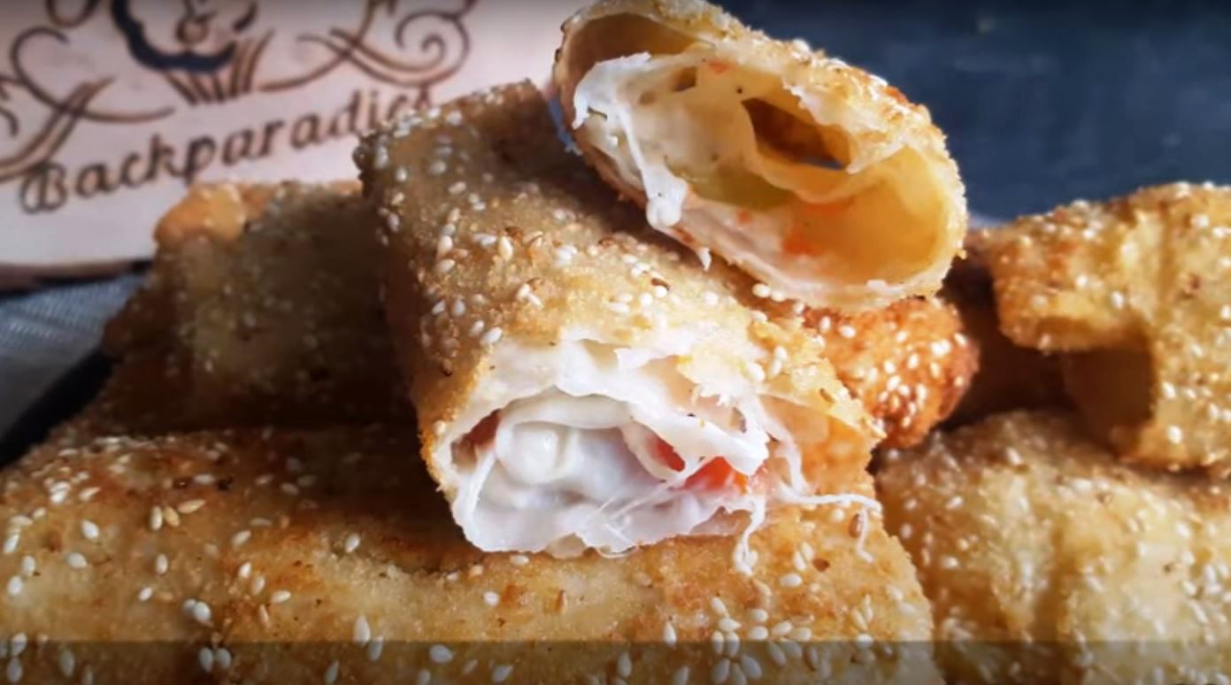 Αλλοιφουμε κάθε φύλλο με βούτυρο βάζουμε μέσα μία μοτσαρέλα,ντομάτα,πιπεριά και τυλίγουμε. Στο τέλος αλλοιφουμε με λίγο νεράκι να σφραγίσει η φλογέρα στο τέλος του φύλλου αλλά και τα πλαϊνά. Κάνουμε το ίδιο μέχρι να τελειώσουν τα φύλλα.