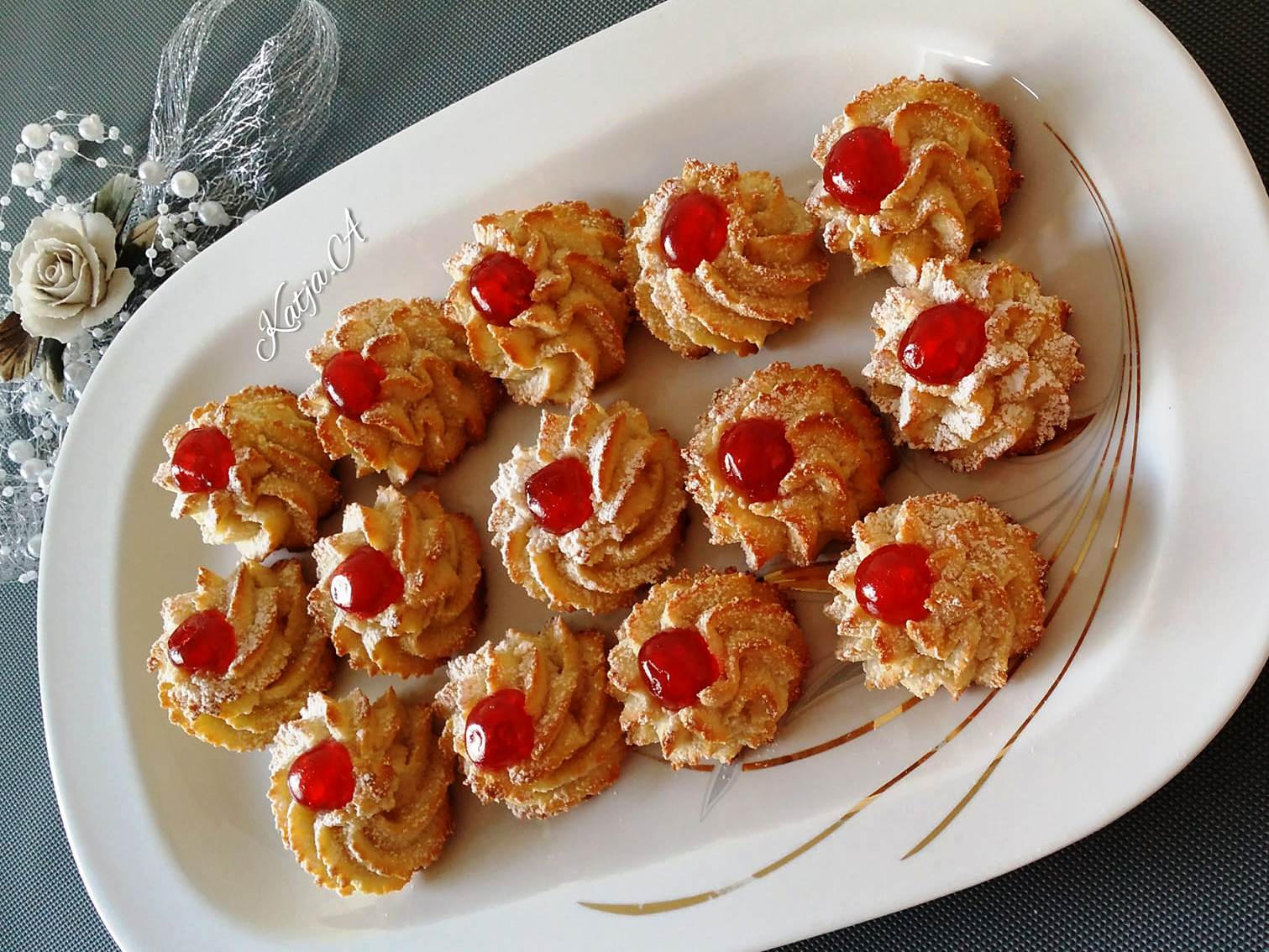 Βάλτε τη ζύμη σε μία σακούλα ζαχαροπλαστικής με τη μεγάλη άκρη του αστεριού και σχηματίστε τα γλυκά απευθείας στο χαρτί ψησίματος, πασπαλίστε τα όλα με ζάχαρη άχνη και βάλτε τα ζαχαρωμένα κεράσια κομμένα στο μισό ή ένα ξεφλουδισμένο αμύγδαλο στο κέντρο, αν προτιμάτε. Βάλτε σε ένα δροσερό και ξηρό μέρος (στο ψυγείο το καλοκαίρι) από 8 έως 10 ώρες, έτσι ώστε να μπορεί να σχηματίσει αυτή την υπέροχη εξωτερική κρούστα, μετά ψήνουμε στους 170 ° για 12/14 λεπτά