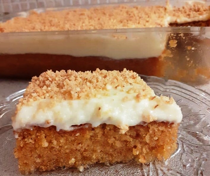 Αδειάζουμε την κρέμα επάνω από το γλυκό στο ταψί, και την απλώνουμε ομοιόμορφα.