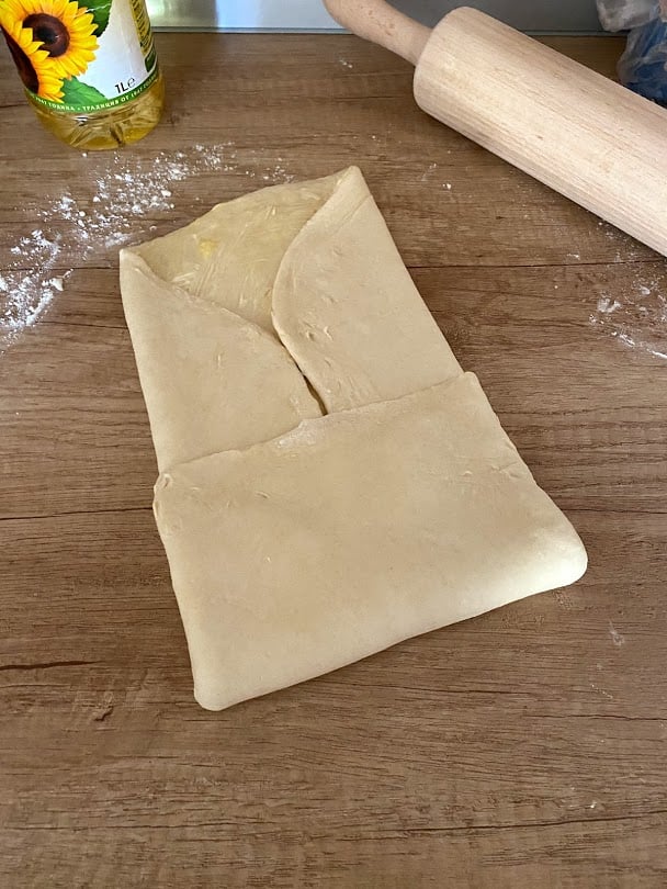 Διπλώνουμε τη ζύμη σαν φάκελο (δείτε εικόνες).
