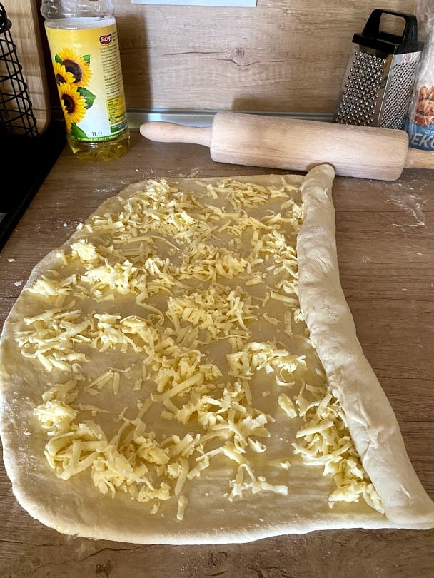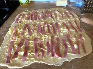 Τρίβουμε το τυρί και κόβουμε το ζαμπόν σε λεπτές λωρίδες. Παίρνουμε το πρώτο κομμάτι ζύμης και το κάνουμε σε φύλλο.Πασπαλίστε λοιπόν ξανά τον πάγκο και τη ζύμη σας. Όταν έχουμε μια λεπτή κρούστα, την αλείφουμε με βούτυρο και πασπαλίζουμε με τυρί και αν θέλουμε τακτοποιούμε τα κομμάτια του ζαμπόν.