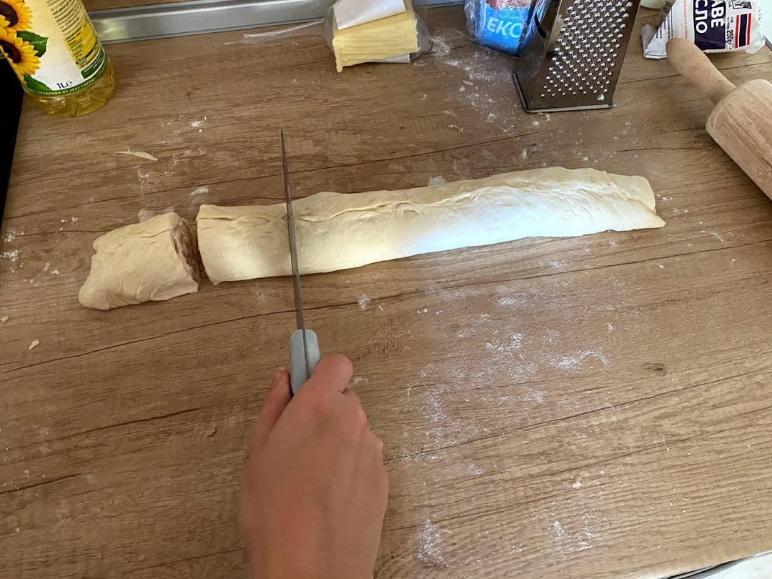 1. Αρχίζουμε να το τυλίγουμε. Όταν τυλίγουμε το ρολό, αν χρειαστεί, πιέζουμε τις άκρες να κολλήσουν και να μην ανοίξει το ρολό. Κόβουμε σε 7-8 κομμάτια και τα απλώνουμε σε ταψί.