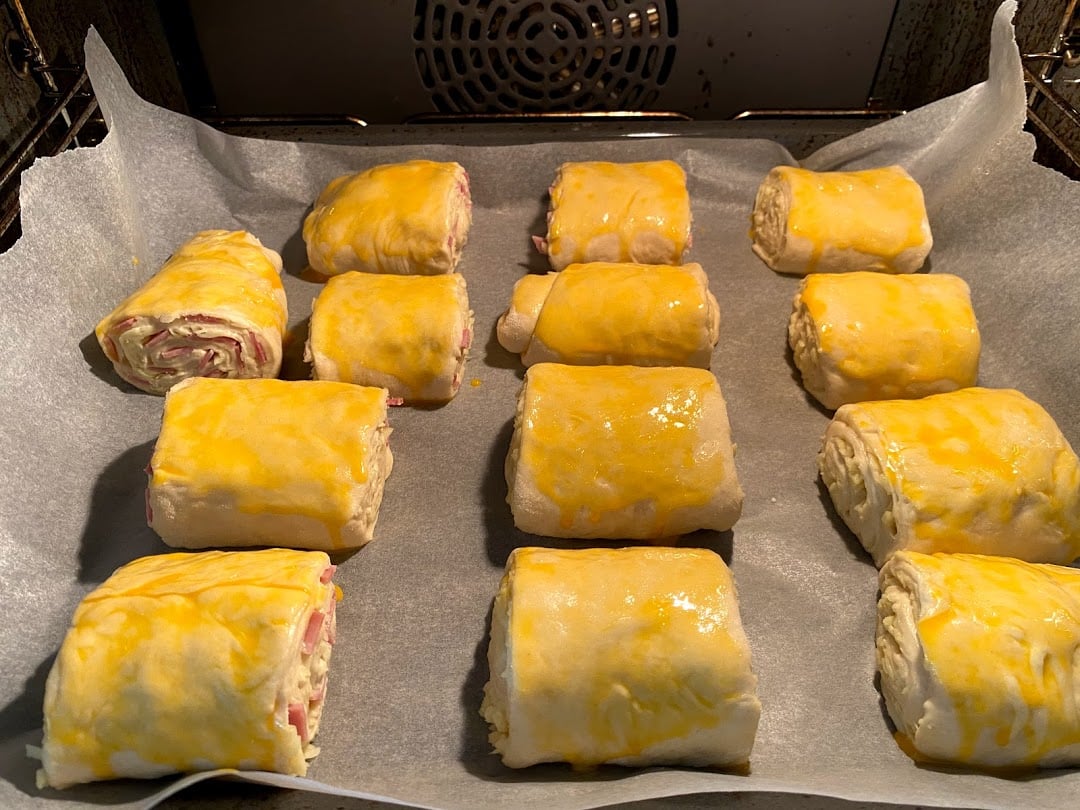 Ένα ταψί γεμάτο χρυσαφένια, φουσκωτά ζαμπονοτυροπιτάκια κομμένα σε ροδέλες, έτοιμα να σερβιριστούν.