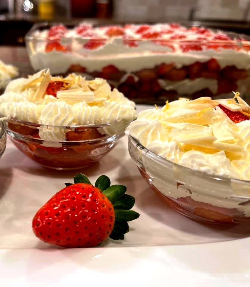 Επίσης μπορείτε σε μπολάκια να βάλετε στην βάση μουσκεμένα σαβαγιαρ κομματάκια μετα φράουλες και μετα κρεμα με μια τσάντα ζαχαροπλαστικής και διακοσμήστε με κομμένες φράουλες και τριμένη σοκολάτα