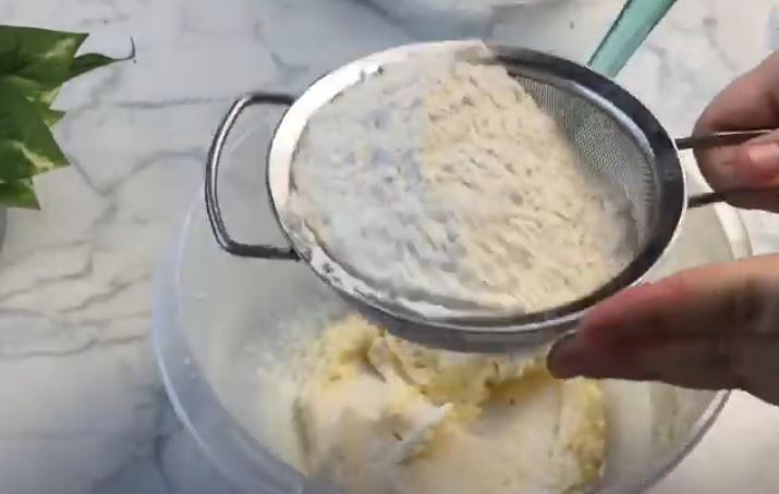 στη συνέχεια ρίχνουμε τη βανίλια κι ανακατεύουμε με μία σπάτουλα κοσκινίζουμε σιγά-σιγά το αλεύρι που έχουμε αναμείξει με το μπέικιν πάουντερ και ανακατεύουμε με τη σπάτουλα