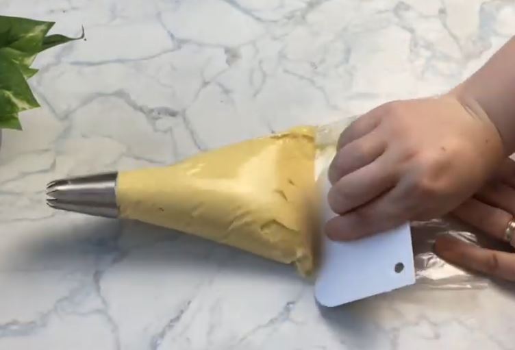 Βάζουμε τη ζύμη σε μία σακούλα ζαχαροπλαστικής την πιέζουμε