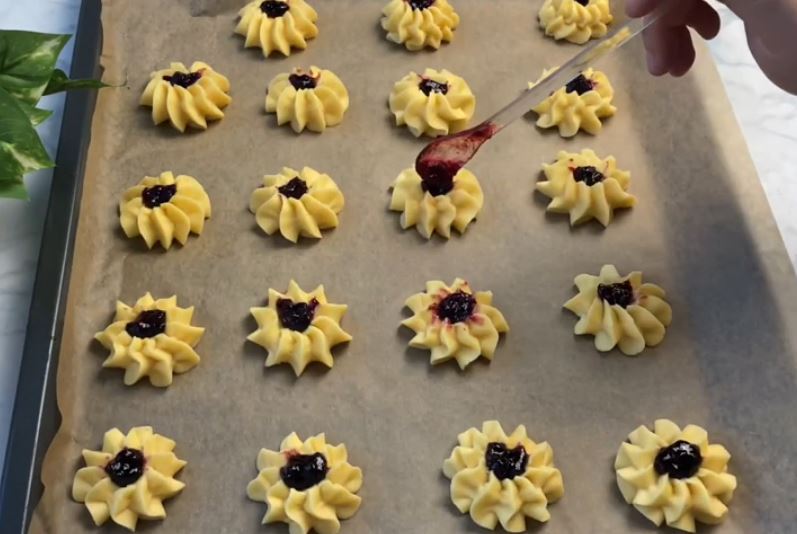 Πιέζουμε στην μέση με το μικρο δαχτυλάκι και κανουμε μια λακουβίτσα στην μέση, και γεμίζουμε με μαρμελάδα.