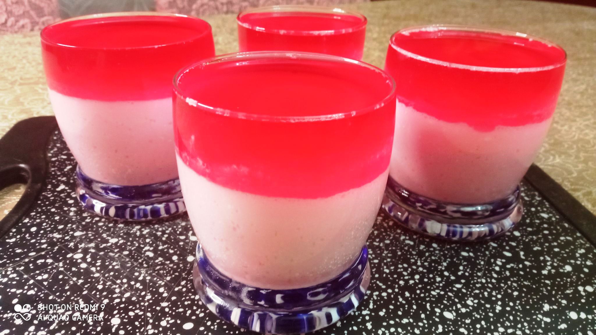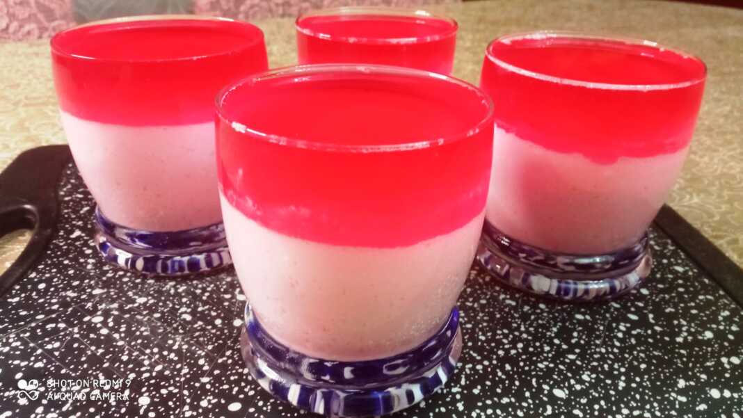 Πρώτη στρώση: Γεμίζουμε τα ποτήρια (4 ποτηρια) αφήνοντας 2 δαχτυλα περιθώριο απο την κορυφη με το μείγμα ζελέ και γιαούρτι.