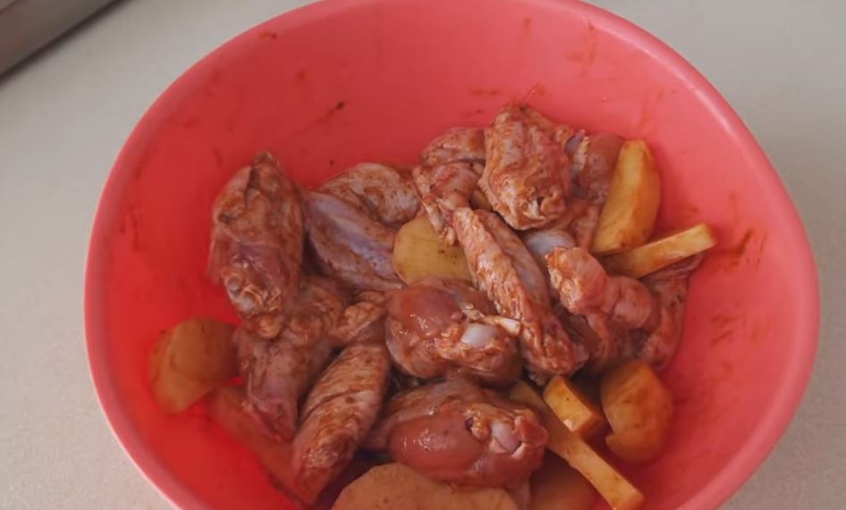 Προσθέτουμε τις φτερούγες κοτόπουλου στην σάλτσα, και αμέσως μετά προσθέτουμε και τις πατάτες. Ανακατεύουμε με τα χέρια πολύ καλά, φροντίζοντας η σάλτσα να καλύψει ομοιόμορφα κάθε φτερούγα και πατάτα.