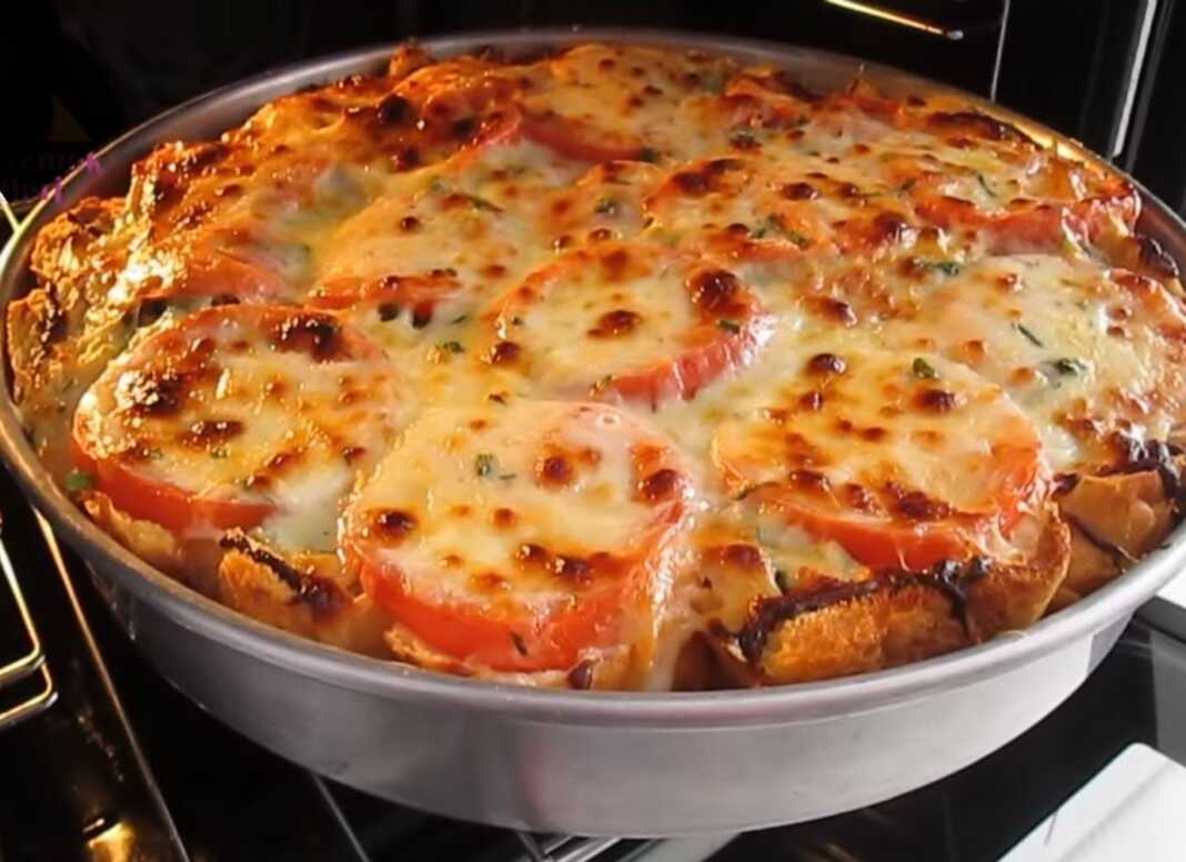 Από πάνω ποτίζουμε τις φέτες με 3-4 κουταλιές με κουτάλα από το μείγμα μας και από πάνω στρώνουμε τις φέτες ντομάτας και πασπαλίζουμε με τριμμένο τυρί.