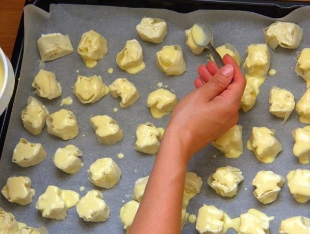 Τακτοποιήστε σε ένα ταψί επενδεδυμένο με λαδόκολα ή λαδωμένο με λάδι.
