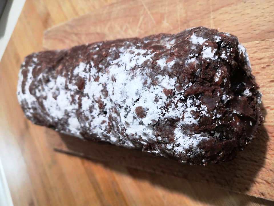 Δίνουμε κυλινδρικό σχήμα ή το κλασικό σχήμα σαλάμι, πασπαλίζουμε τη λαδόκολλα με ζάχαρη άχνη και τυλίγουμε το σαλάμι, έτσι δίνουμε το σχημα σαλαμιου, το τυλίγουμε σε λαδόκολλα και το βάζουμε στο ψυγείο για τουλάχιστον 3 ώρες