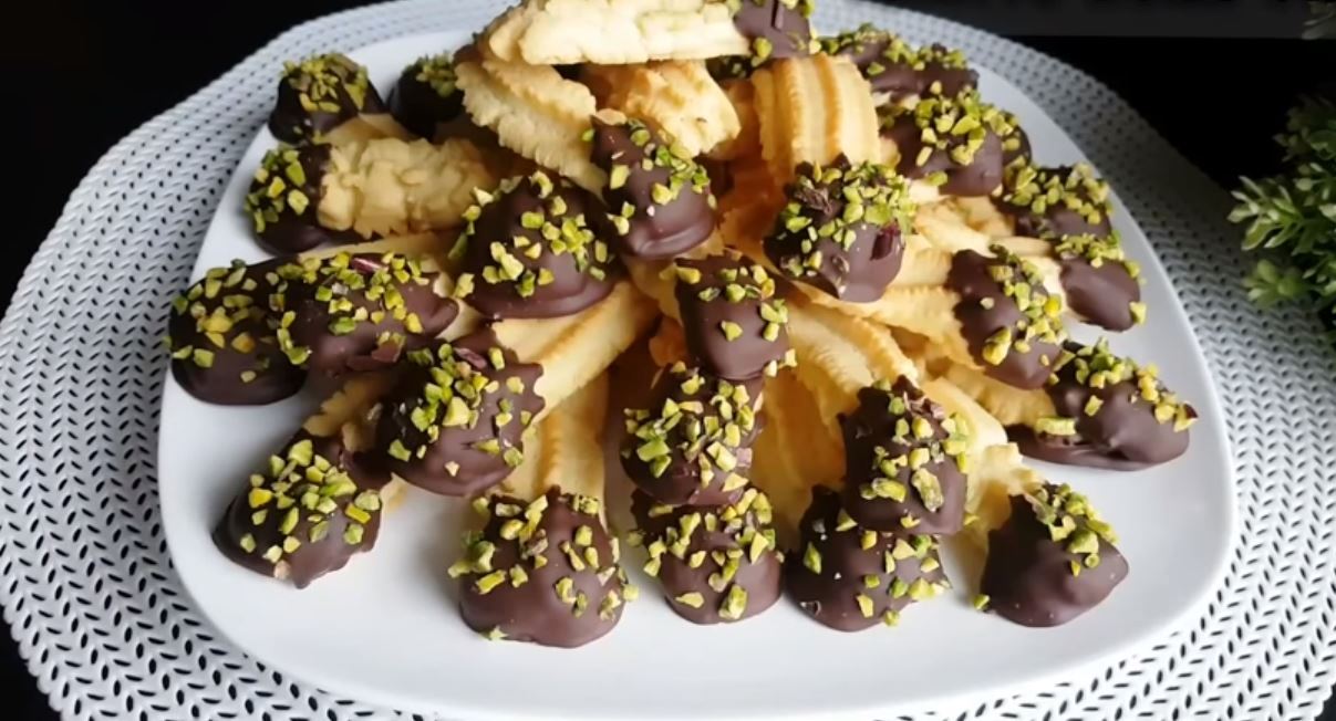 Μόλις τα βγάλουμε και κρυώσουν βουτάμε το ένα μέρος στην κουβερτούρα και το πασπαλίζουμε με το φυστίκι.