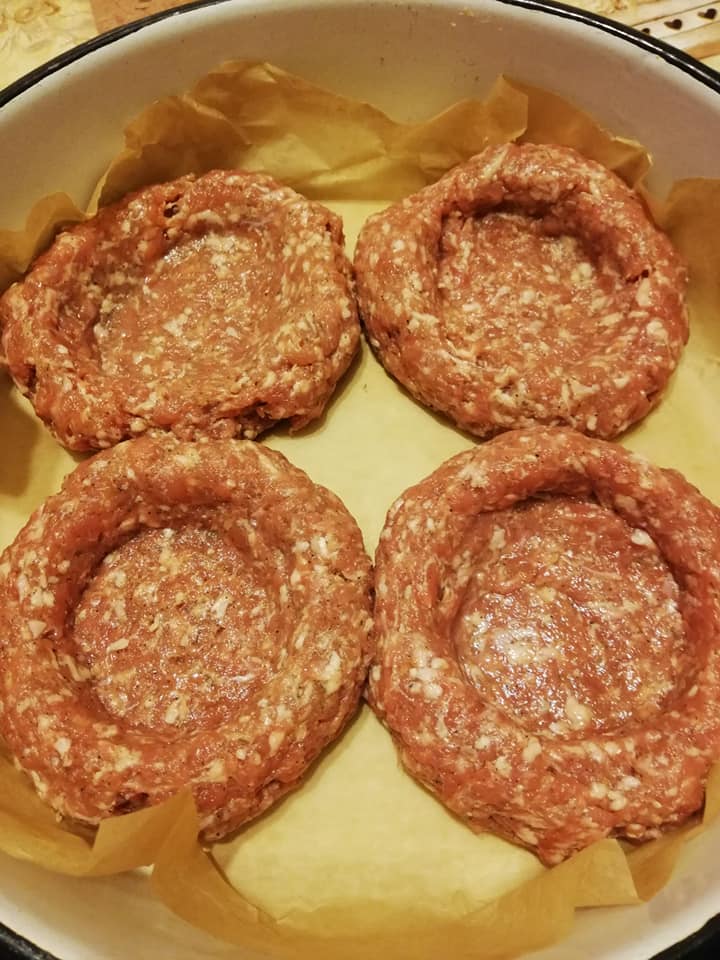 Πλάθουμε σε μπιφτέκια και κάνουμε μια τρύπα βαθιά στη μέση με ένα κουτάλι ή με το χέρι τα έβαλα σε 2 ταψακια.