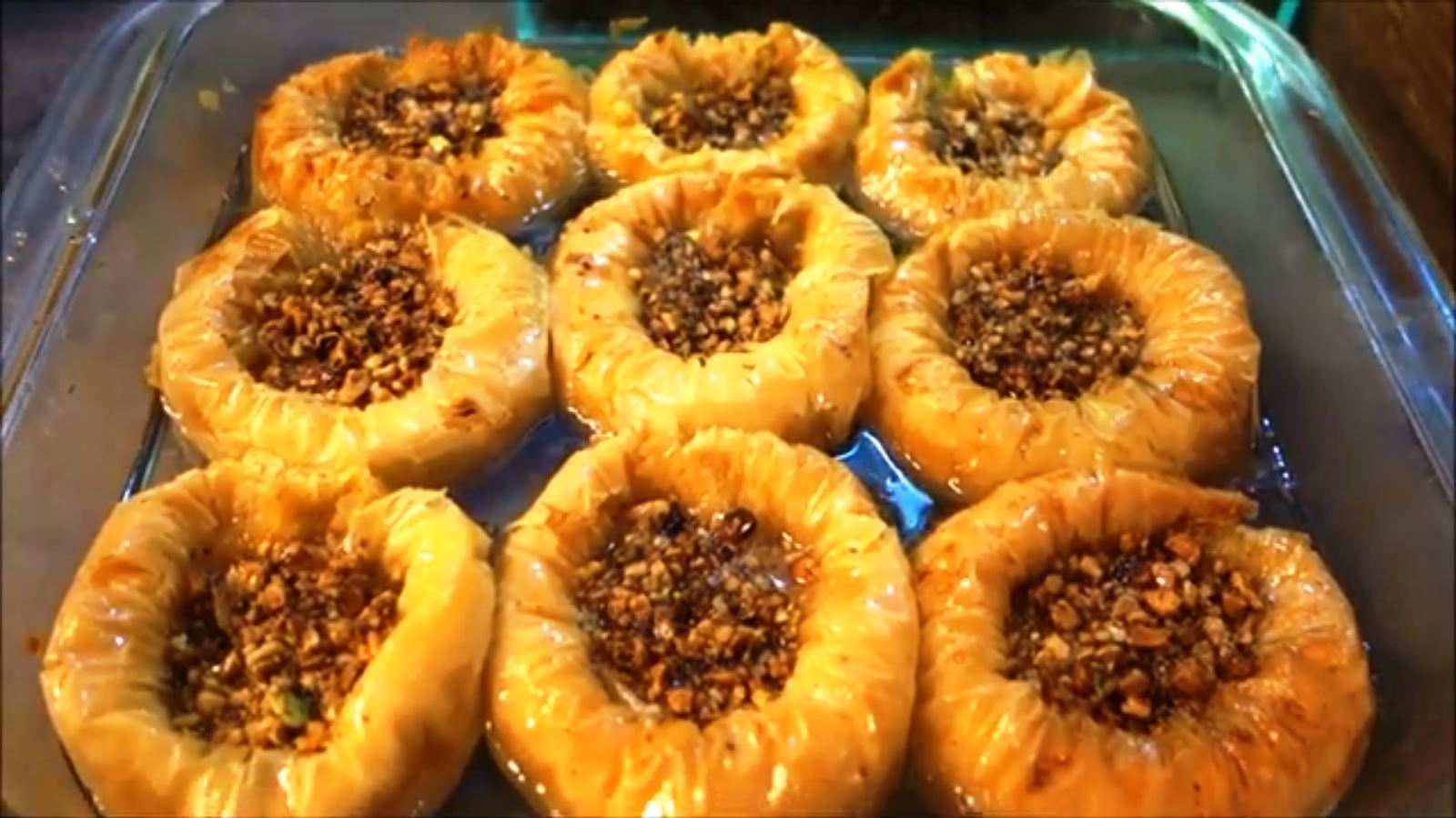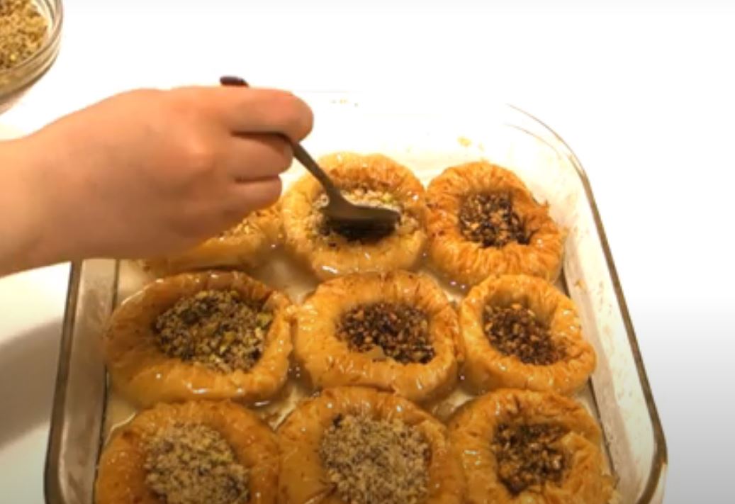 Μόλις τις βγάλουμε από το φούρνο σιροπιάζουμε επί τόπου με το κρύο σιρόπι και συμληρώνουμε λίγο μείγμα ξηρών καρπών από πάνω
