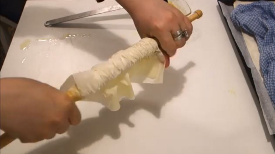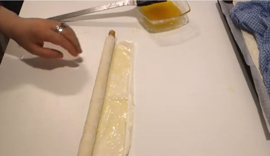 και μετα βάζουμε τον πλάστην στην μία άκρη και το τυλίγουμε πάνω στο πλάστη αλλά σταματαμε να το τυλίγουμε περίπου 8-10 εκ πριν το τέλος.