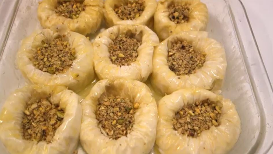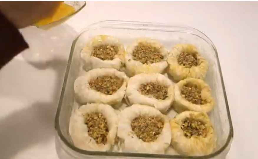Γεμίζουμε τις φωλιές με το μείγμα καρύδι-φυστίκι και μετα αλειφουμε με βουτυρο τις φωλιές