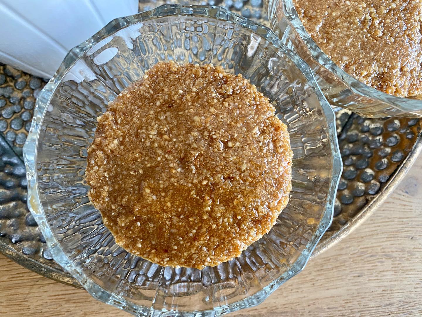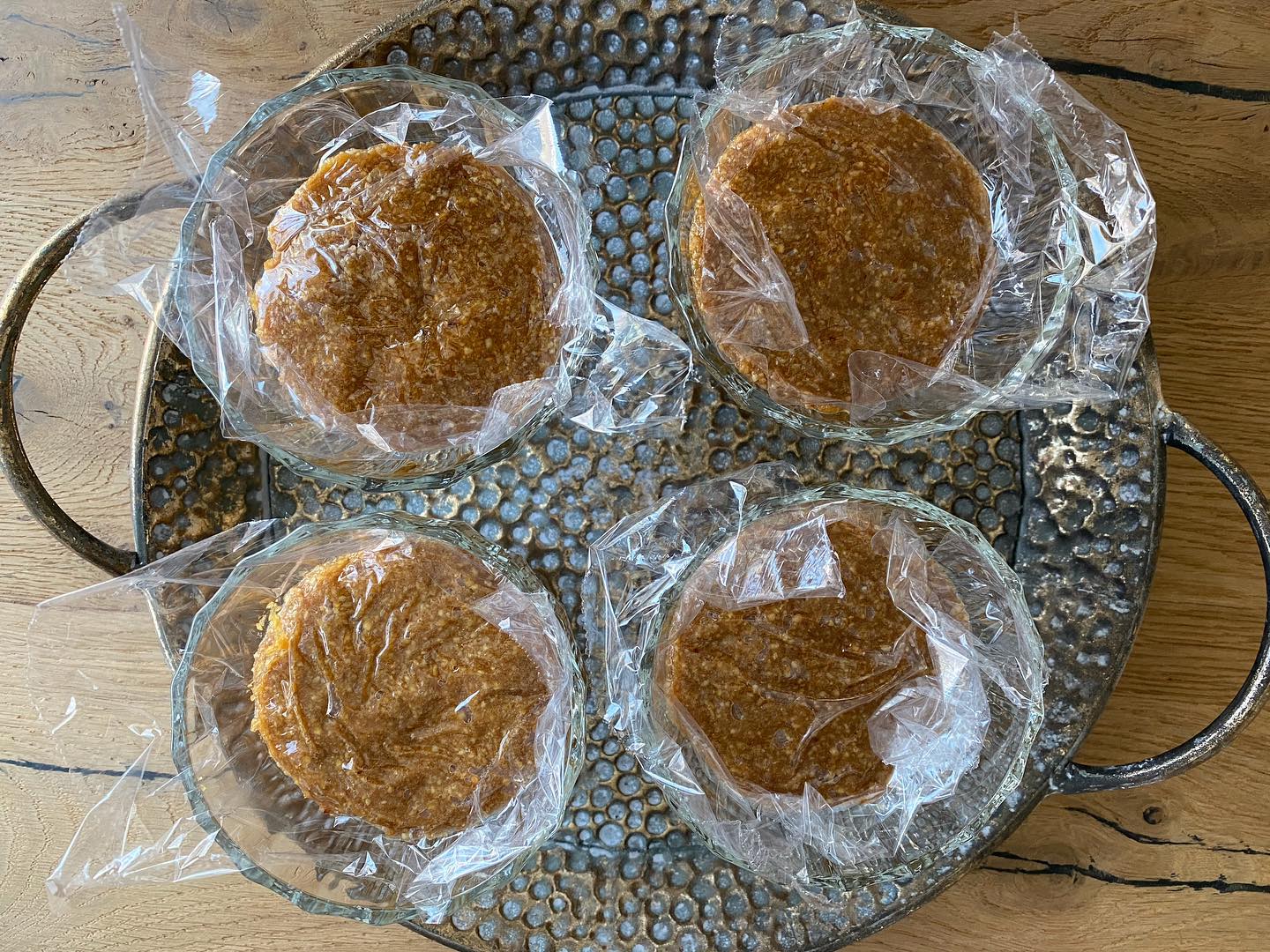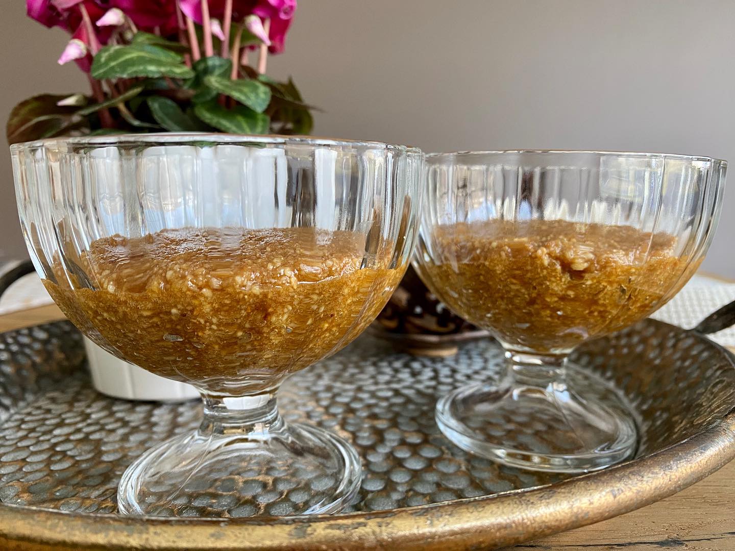 Αποφάσισα να μοιράσω το μείγμα σε μπολ για μεμονωμένες μερίδες, αλλά μπορεί να μοιράζεται και σε ρηχό πιάτο. Ισιωσα απο πάνω προσεκτικά την επιφάνεια με ένα βρεγμένο κουτάλι και σκέπασα σφιχτά με μεμβράνη για να μην στεγνώσει.