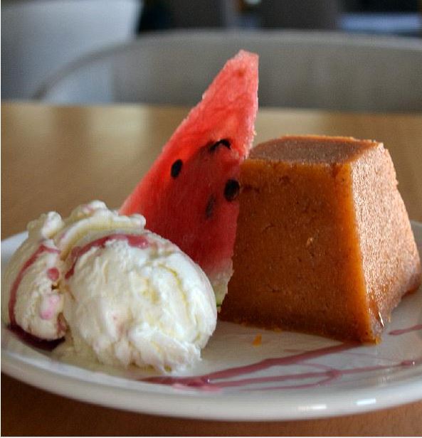 5. Σερβίρετε το χαλβά χλιαρό ή κρύο εντελώς, συνοδεύοντας με παγωτό βανίλια και λεπτές φετούλες από καρπούζι. Περιχύνετε με λίγο σιρόπι της επιλογής σας και σερβίρετε.