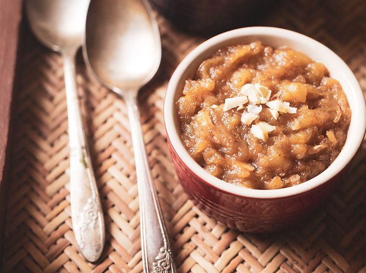 Με ένα κουτάλι λιώνουμε τα μήλα και συνεχίζουμε να ανακατεύουμε, ώστε το μίγμα να μην κολλάει στον πάτο της κατσαρόλας. Θα μπορούσατε να κρατήσετε μερικά κομμάτια μικρού μεγέθους, αν θέλετε.