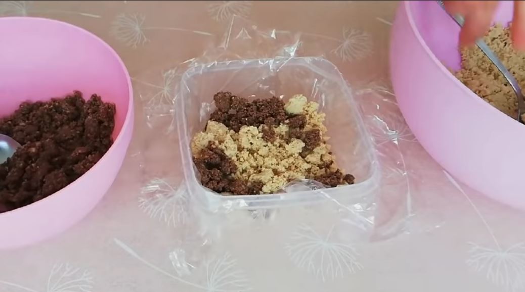 Στρώνουμε ένα τετράγωνο μπολάκι με μια μεμβράνη και ρίχνουμε μια στρώση λευκη ζύμη και απο πάνω λίγο ζύμη με κακαο και το κάνουμε αυτό εναλαξ μέχρι να εξαντληθούν.