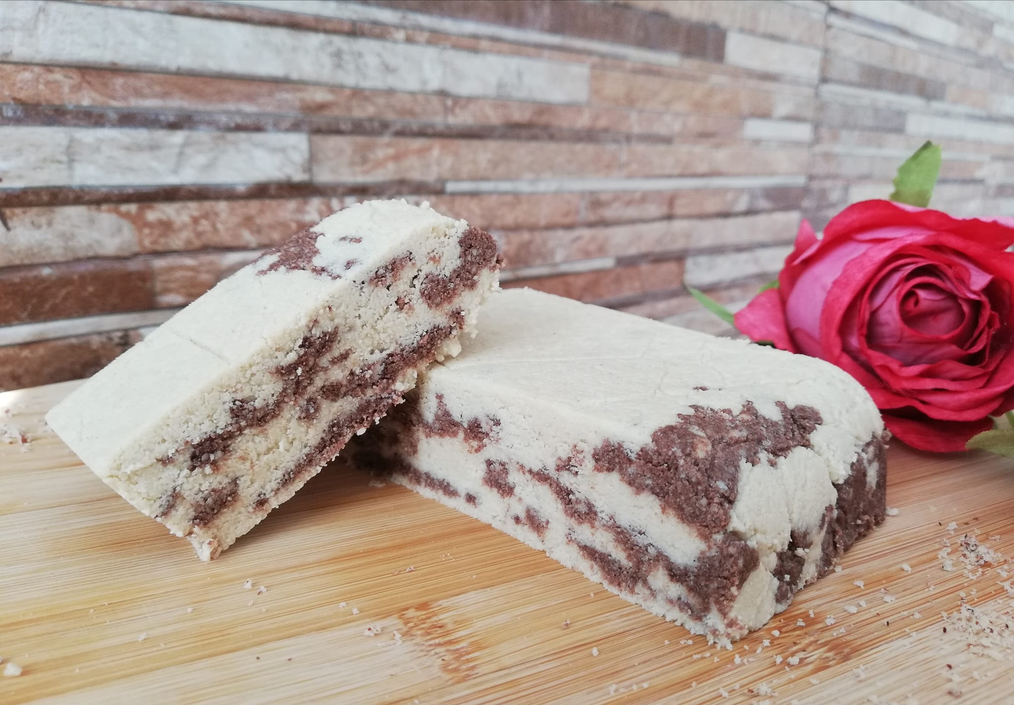 Στρώνουμε ένα τετράγωνο μπολάκι με μια μεμβράνη και ρίχνουμε μια στρώση λευκη ζύμη και απο πάνω λίγο ζύμη με κακαο και το κάνουμε αυτό εναλαξ μέχρι να εξαντληθούν.