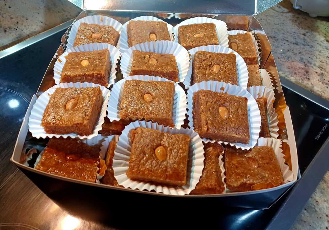 Αφήνουμε να απορροφήσει καλά ο χαλβάς το σιρόπι πριν τον κόψουμε